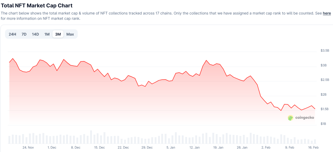 Хотя в первые две недели 2026 года рынок NFT стартовал уверенно, с тех пор его совокупная капитализация, по данным CoinGecko, упала более чем на 50% — с $3,2 млрд до $1,55 млрд — на фоне общего снижения рынка.
