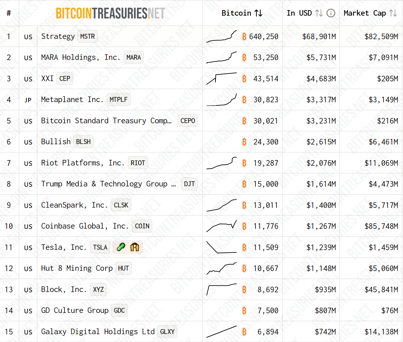 На втором месте находится MARA Holdings (Marathon Digital) с 53,250 BTC, стоимостью примерно 5,7 миллиарда долларов, за которой следует XXI (CEP) с 43,514 BTC, оцененных в 4,7 миллиарда долларов. Японская Metaplanet (MTPLF) занимает четвертое место с 30,823 BTC, а Bitcoin Standard Treasury Company (CEPO) замыкает пятерку с 30,021 BTC.