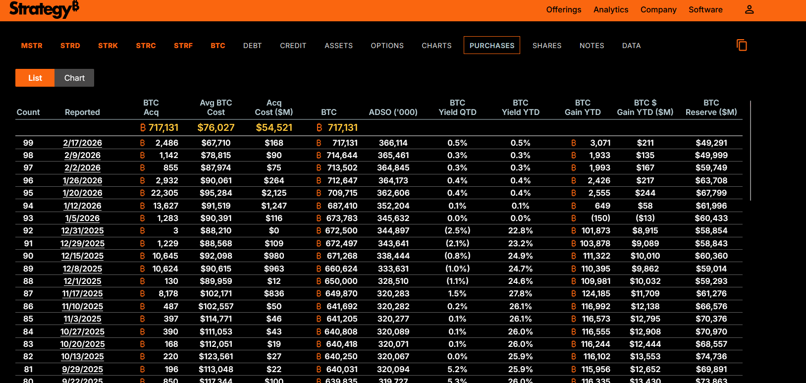 Сейчас Strategy владеет 717 131 BTC при средней цене покупки $76 027 за монету. На фоне снижения курса BTC до примерно $64 700 на момент публикации средняя стоимость приобретения оказалась выше рыночной.