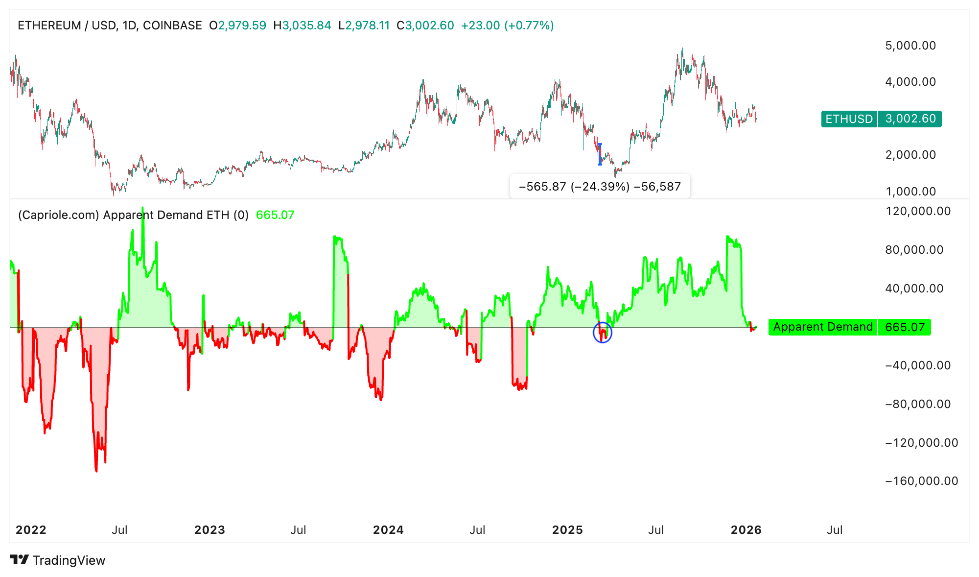 По данным Capriole Investments, метрика Ethereum Apparent Demand упала до -3 562 ETH на 16 января с более чем 92 000 ETH 13 декабря. К моменту подготовки материала показатель немного восстановился до 665 ETH.