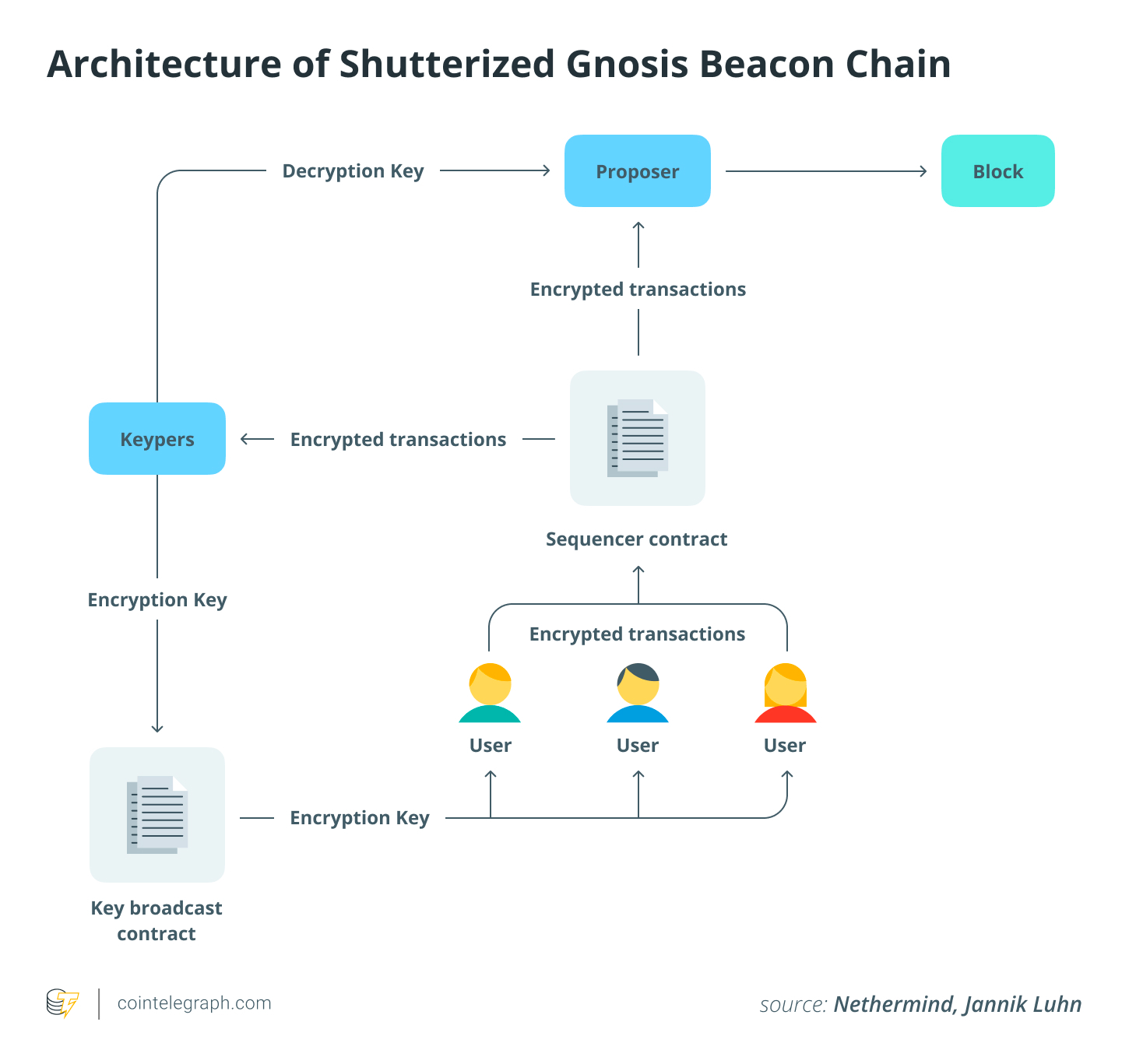 Предложители блоков упорядочивают эти зашифрованные данные в блок, и как только блок завершается либо нарушается условие раскрытия, каждый член комитета публикует свою часть данных для расшифровки. Потребное количество правильных частей от комитета затем объединяется для восстановления исходной транзакции. Как и в настройке multisig, квалифицированное большинство участников комитета достаточно для этого. После завершения последовательности и расшифровки транзакции исполняются виртуальной машиной сети.