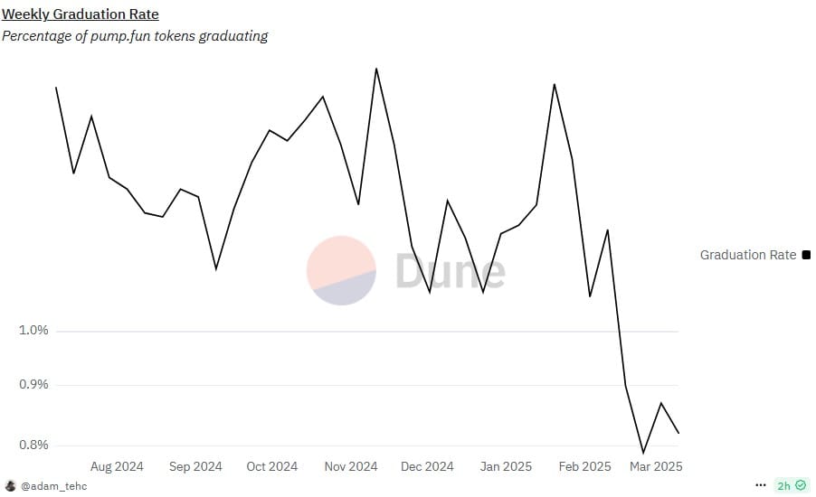 Лихорадка мемкойнов на платформе Pump.fun сталкивается с проблемами, так как «уровень выпуска» токенов снизился до менее чем 1% в течение четвертой недели подряд.