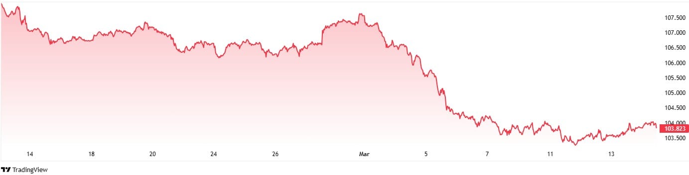 С тех пор доллар США ослабел. За последний месяц индекс доллара США (DXY), измеряющий доллар по отношению к корзине основных валют, достиг пика в 107,61 28 февраля и снизился до 103,95 14 марта.