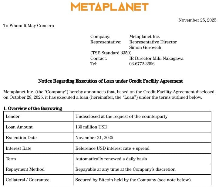 Во вторник Metaplanet сообщила, что завершила сделку по кредиту 21 ноября в рамках ранее объявленного кредитного соглашения. Этот заем является частью кредитной линии компании на сумму $500 миллионов, которая позволяет привлекать краткосрочную ликвидность, используя Биткойн (BTC) в качестве залога.