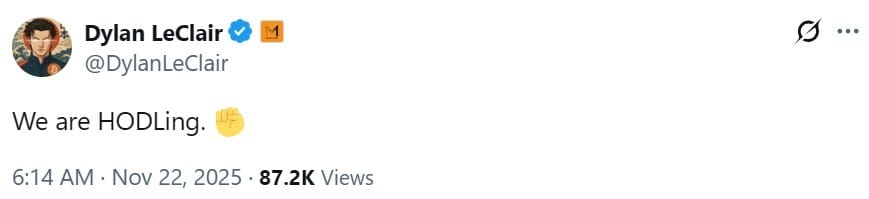 Несмотря на это, компания продолжает удерживать BTC и накапливать больше. Директор по стратегии Биткойна Дилан Леклер заявил в X, что компания придерживается стратегии «HODLing».