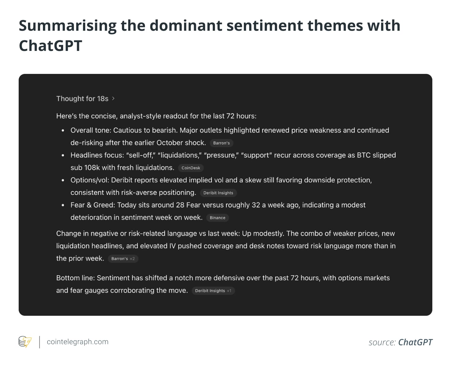 ChatGPT может обрабатывать тысячи постов и заголовков, чтобы выявлять изменения в рыночных нарративах. Когда оптимизм исчезает и термины, связанные с тревогой, такие как "ликвидация", "маржа" или "распродажа", начинают доминировать, модель может количественно оценить это изменение тона.