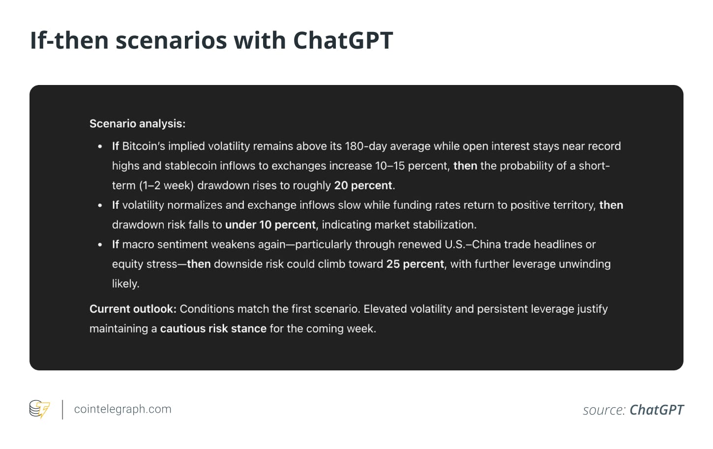 “Действуйте как криптостратег. Создавайте краткие условные сценарии риска, используя рыночные и данные о настроениях.
