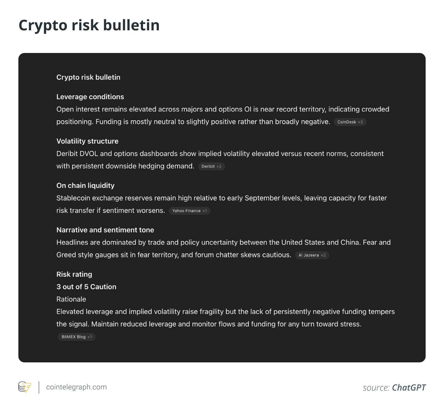 “Действуйте как аналитик рисков на крипторынке. Используя предоставленные данные, создайте краткий бюллетень риска. Суммируйте текущие условия кредитного плеча, структуру волатильности и преобладающий тон настроений. Завершите, назначив оценку риска от 1 до 5 (1=Низкий, 5=Критический) с кратким обоснованием.”