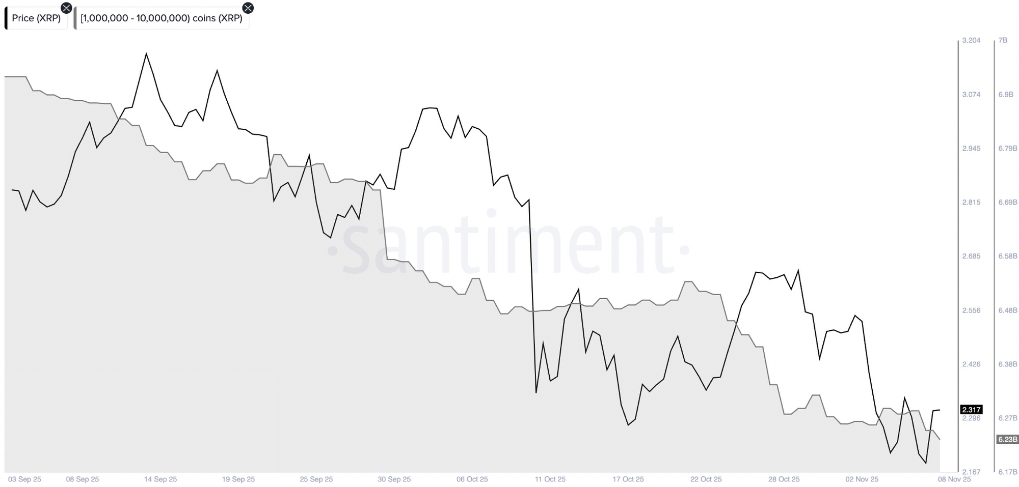 Метрика распределения предложения от Santiment указывает на то, что держатели от 1 до 10 миллионов токенов XRP продали ещё 500 000 токенов всего за последние 48 часов.