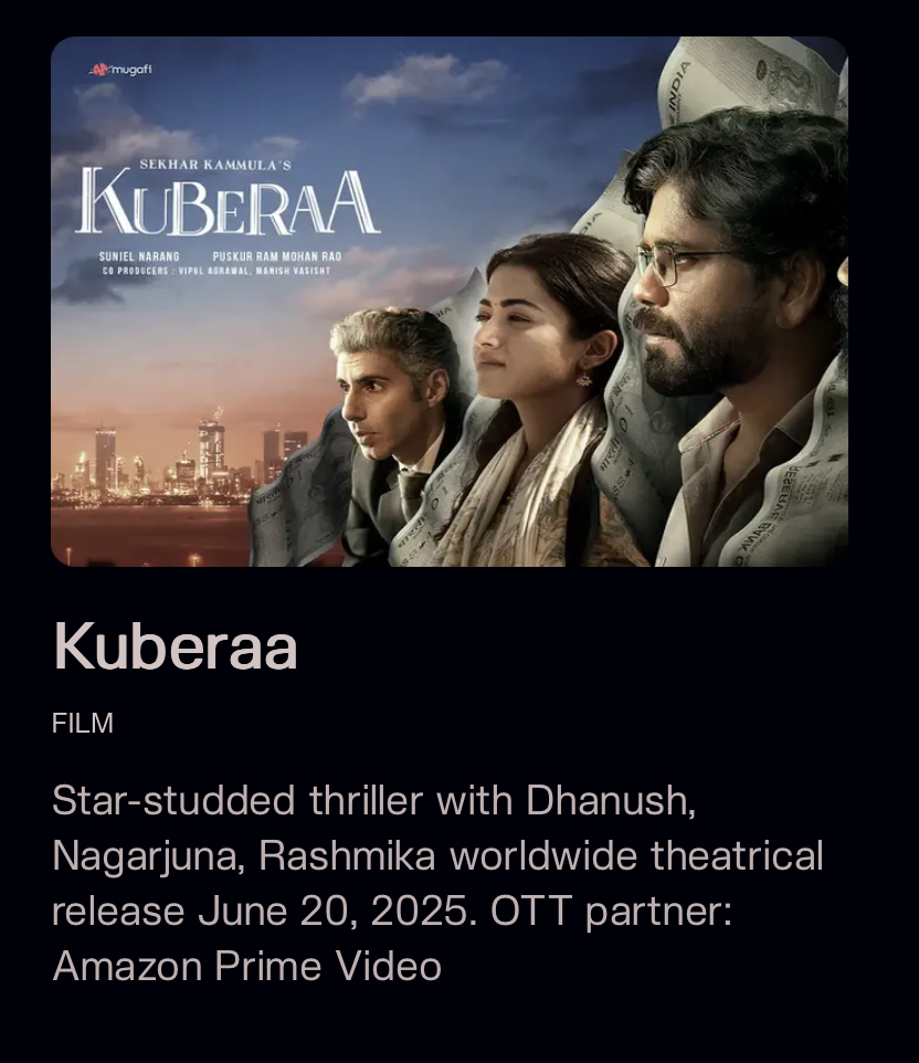 Mugafi, основанная в 2020 году в Индии, поддерживается несколькими инвесторами и компаниями в сфере развлечений, включая Nexus VP, HashedEM, Netflix, Amazon и Panorama Studios и другие. Их релиз "Кубераа" 2025 года собрал 35 миллионов долларов США в кассовых сборах и распространялся через Amazon Prime Video.