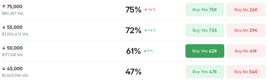 Также пользователи активно закладывают сценарии снижения ниже $50 000 и $45 000: вероятности оцениваются в 67% и 47% соответственно, а объемы торговли по этим исходам составляют примерно $170 тыс. и $1,4 млрд.