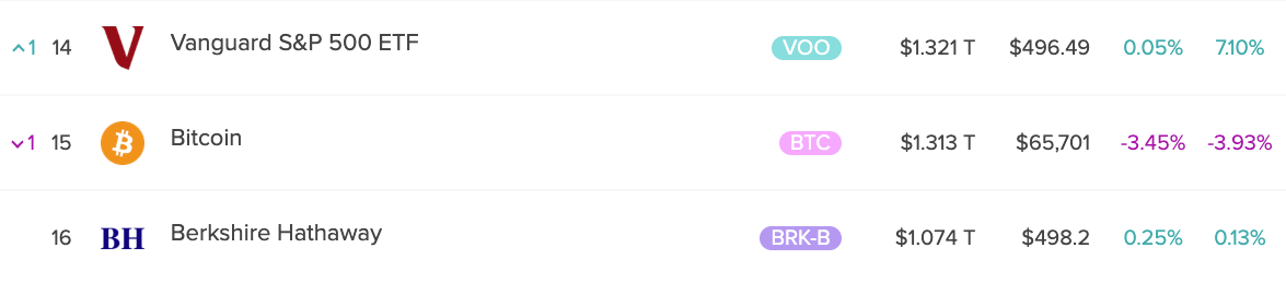 Капитализация биткоина снизилась примерно до $1,31 трлн: актив опустился на 15-е место в мировом рейтинге, уступив Vanguard S&P 500 ETF (VOO), согласно 8marketcap.