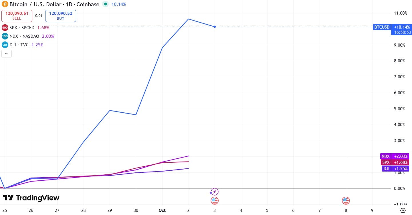 Биткоин поднялся выше $120,000 в пятницу, поскольку приостановка работы правительства США продолжается третий день, создавая оптимизм среди инвесторов, что крупнейшая криптовалюта по рыночной капитализации может продолжить свой привычный "Uptober".