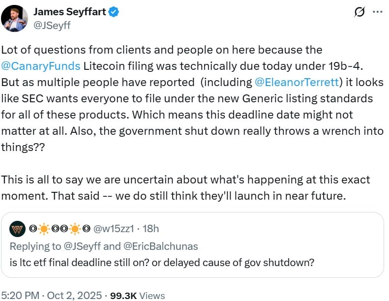Приостановка работы правительства, вероятно, замедлит рассмотрение заявок на криптовалютные ETF со стороны Комиссии по ценным бумагам и биржам. Предложения, связанные с Litecoin (LTC), Solana (SOL) и XRP (XRP), имеют сроки принятия решения в течение месяца, но теперь это, вероятно, будет отложено до возвращения агентства к нормальной работе.