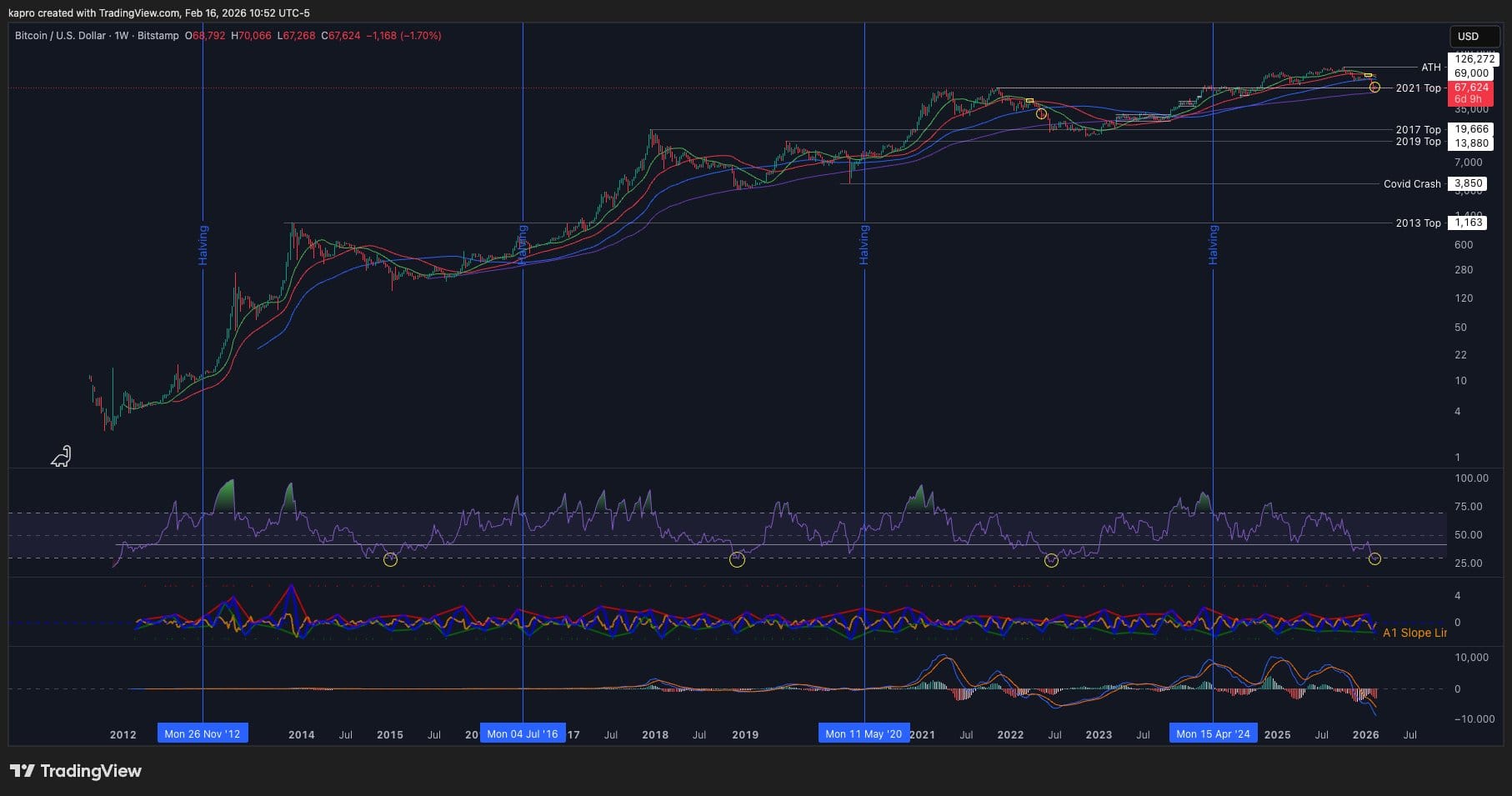 По его словам, недельный RSI приближается к уровням, которые исторически оказывались «раз в цикл» минимальными значениями в зоне перепроданности: в 2015 и 2018 годах это совпало с дном, а в 2022-м привело к консолидации примерно на пять месяцев перед формированием макродна.