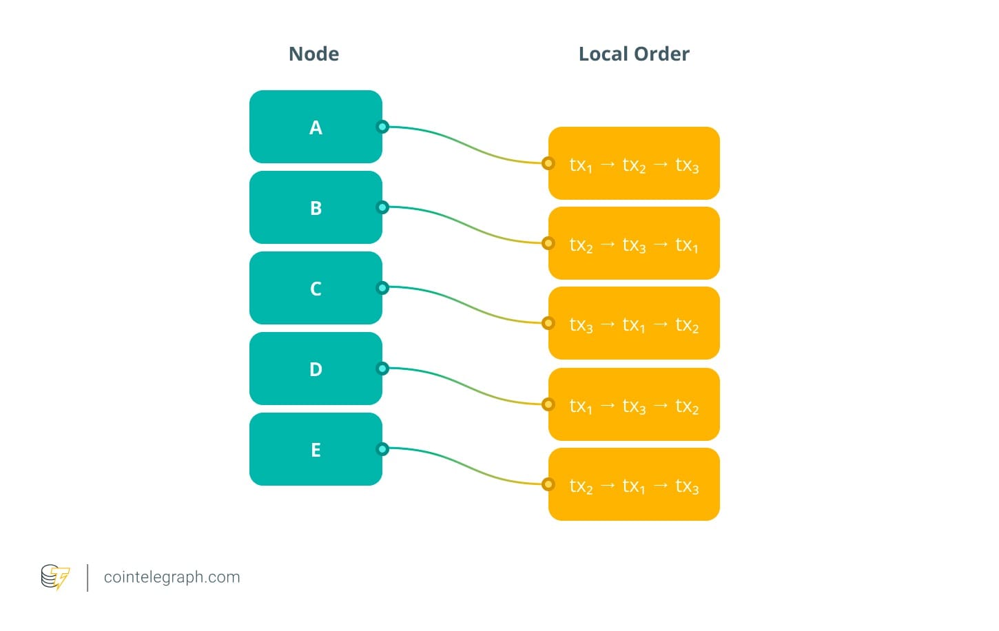 Предположим, пять узлов (A–E) участвующих в консенсусе получают три транзакции: tx₁, tx₂ и tx₃. Из-за задержек в сети их локальные порядки различаются: