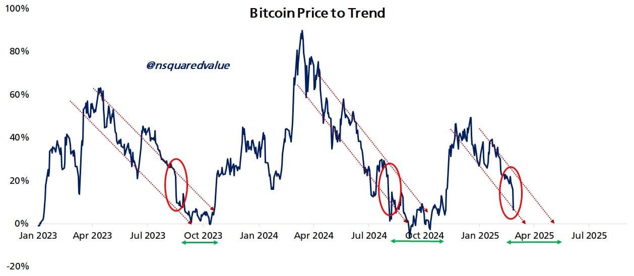 В конце февраля он утверждал, что будет «сложно» опустить рынок ниже $80,000, основываясь на показателе Bitcoin Price to Trend.