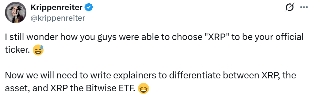 Пользователь X под ником Krippenreiter попросил объяснить, как удалось выбрать XRP в качестве официального тикера, поскольку теперь придется разъяснять различия между XRP как активом и XRP как ETF от Bitwise.