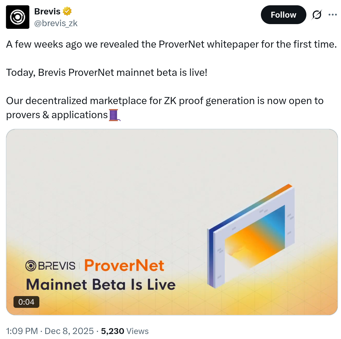 В своем объявлении Brevis также отмечает, что он уже “постепенно мигрирует” рабочие нагрузки продукции на ProverNet. На данный момент сервис переводит “подмножество доказательств исполнения блоков Ethereum с ETHProofs.”