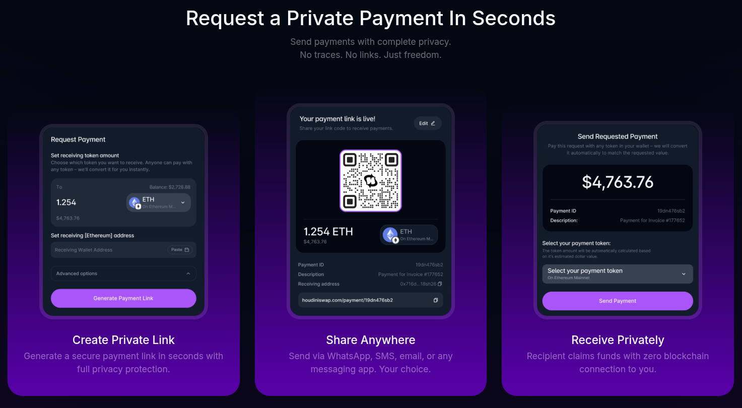 Согласно объявлению, Houdini Pay позволяет пользователям создавать платежные ссылки для более чем 4,000 цифровых активов на разных блокчейнах. Актив конвертируется в предпочитаемую получателем валюту, а маршрутизация платежа через систему разрушает связь в блокчейне между отправителем и получателем, предотвращая возможность отслеживания кошельков.