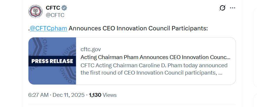 “Мы развиваем успех Форума генеральных директоров криптовалют CFTC и совместного круглого стола SEC-CFTC с нашим Советом по инновациям CFTC, ориентированным на развитие структуры рынков деривативов”, - заявила исполняющая обязанности председателя CFTC Каролина Фам.
