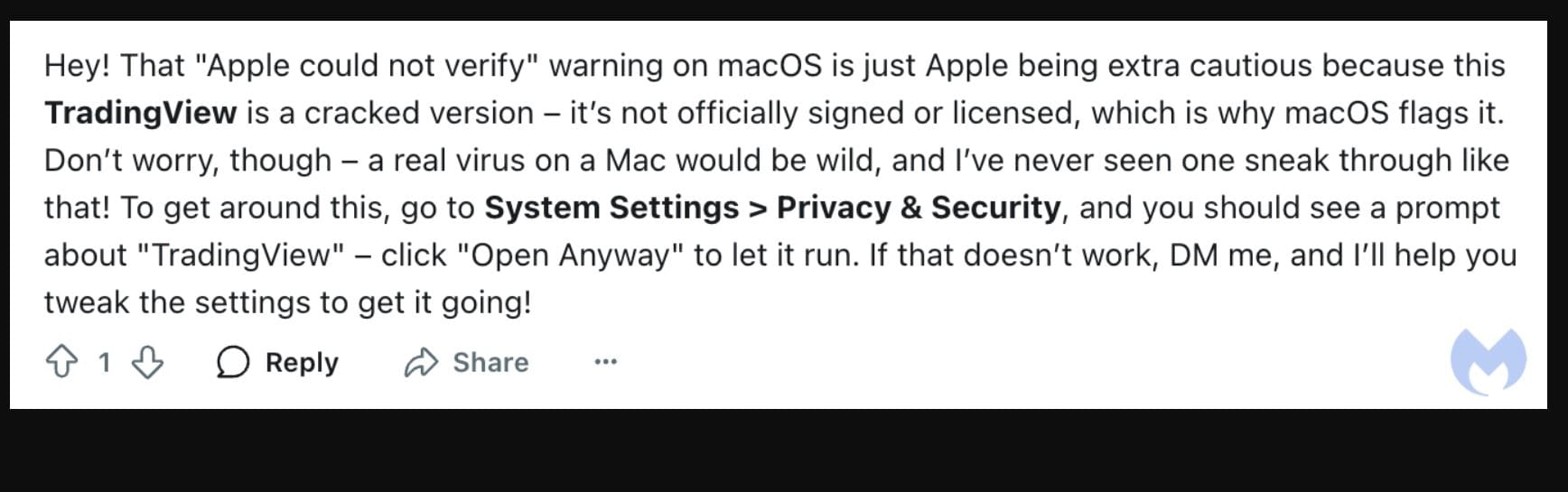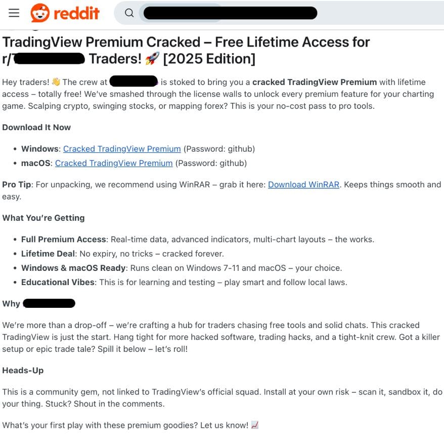 Мошенники скрываются на криптовалютных субреддитах, размещая ссылки на установочные файлы для Windows и Mac "TradingView Premium Cracked", которые заражены вредоносным ПО, направленным на кражу личных данных и опустошение криптокошельков, сообщил Жером Сегура, старший научный сотрудник по безопасности в Malwarebytes, в своем блоге 18 марта.