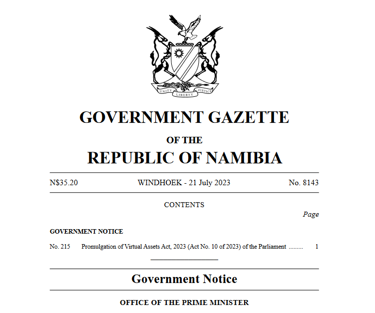 В 2023 году Намибия ввела в действие Закон о виртуальных активах (VAA). Подобно многим другим рамкам, он создал руководства для VASPs, включая режимы лицензирования и надзора. Национальная ассамблея заявила, что ее основные цели — защита потребителей, предотвращение злоупотреблений на рынке и снижение рисков отмывания денег и незаконного финансирования.