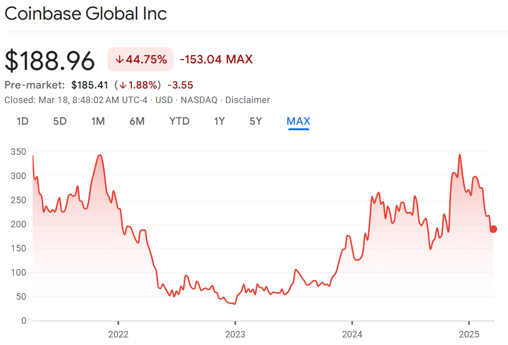 Если акции Coinbase достигнут отметки в 310 долларов, это будет означать рост более чем на 64% по сравнению с текущей ценой в 188 долларов, согласно данным Google Finance.