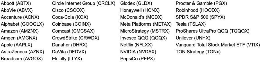 Изначально будут представлены 35 токенизированных акций, включая Circle (CRCLX), Coinbase (COINX), Robinhood (HOODX) и TON Strategy (TONx).