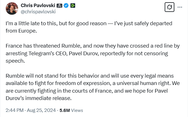 Крис Павловски, генеральный директор видеоплатформы Rumble, заявил, что это стало последней каплей для него и его компании, которая ранее уже вступала в конфликты с французскими властями по поводу цензуры.
