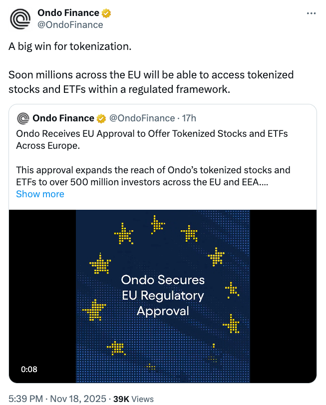 Этот регуляторный шаг позволяет Ondo работать в рамках «единых, регулируемых европейских стандартов с установленными мерами защиты инвесторов», отметила компания.