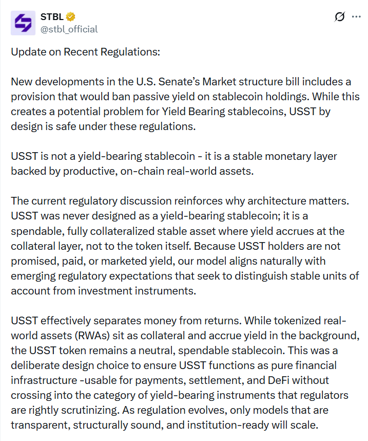 STBL также писала, что отделение стейблкоина от доходности призвано снизить риски, связанные с регуляторным вниманием к доходным стейблкоинам.
