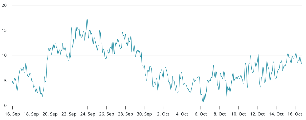 Дельта-скью по опционам биткоина поднялась выше 10%, что показывает, что профессиональные трейдеры платят премию за пут-опционы, что является типичным признаком медвежьих настроений. В нейтральных условиях этот показатель обычно колеблется от -6% до +6%. Более того, скью ухудшился с пятницы, что предполагает, что трейдеры становятся более сомневающимися в бычьих перспективах биткоина.
