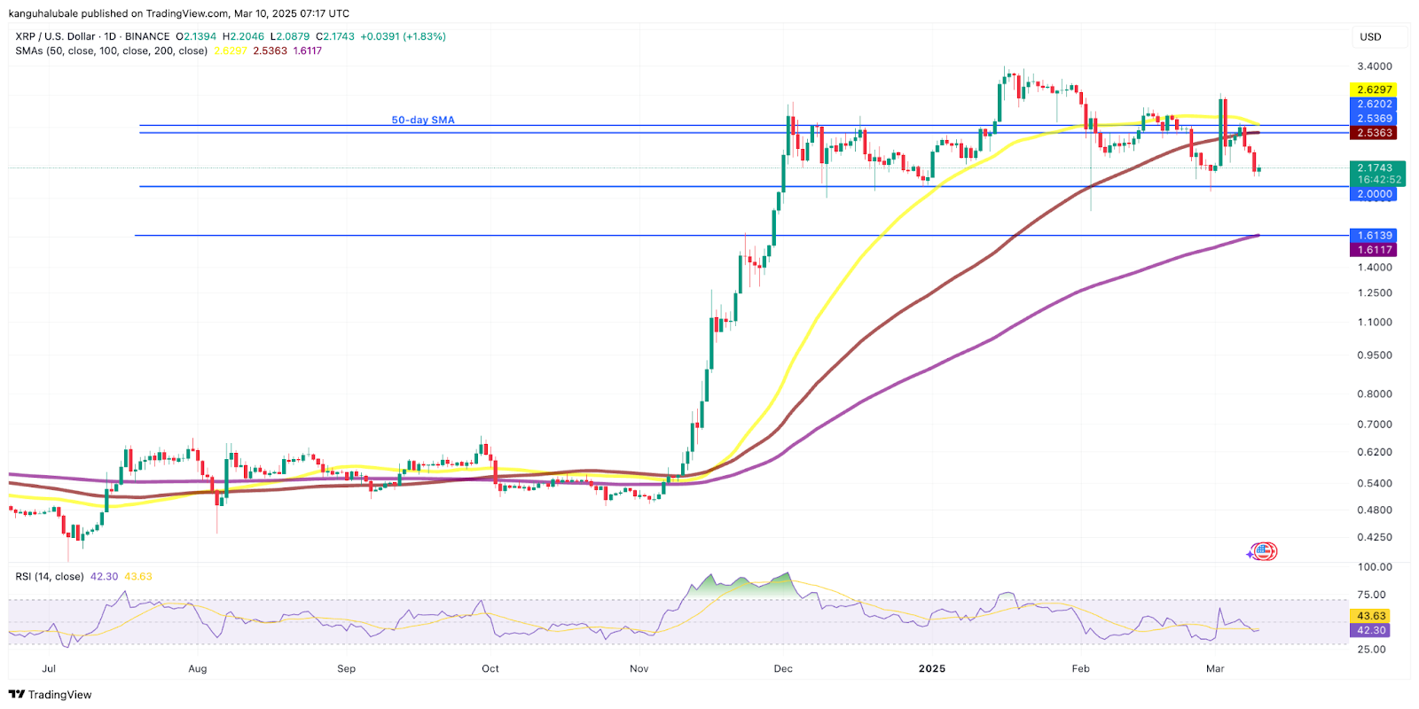 Как ранее сообщалось, если критический уровень $2 будет пробит, XRP может упасть к своей 50-недельной экспоненциальной скользящей средней (EMA) на уровне $1.46, особенно на фоне угасания шумихи вокруг стратегического резерва США.