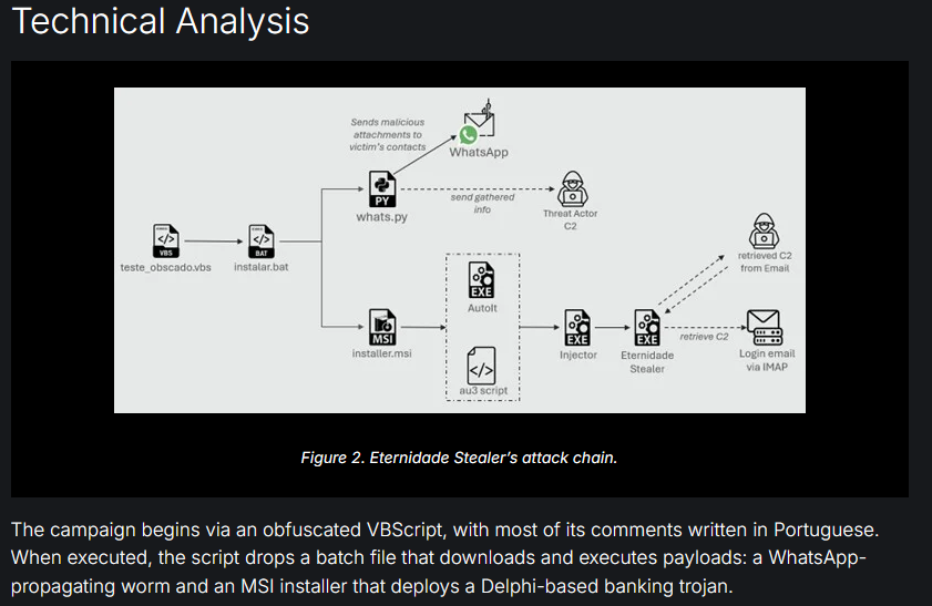 Согласно последнему докладу исследовательской группы по кибербезопасности SpiderLabs от компании Trustwave, банковский троян, известный как «Eternidade Stealer», распространяется через социальную инженерию в приложении для обмена сообщениями WhatsApp, используя такие уловки, как «поддельные государственные программы, уведомления о доставке», сообщения от друзей и мошеннические инвестиционные группы.