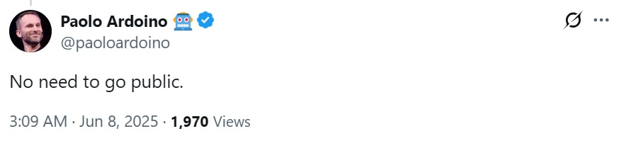 Генеральный директор Tether Паоло Ардоино ответил Ма, сказав, что, хотя $515 миллиардов — это «красивое число», он считает это «немного пессимистичным», учитывая свои запасы биткойнов и золота. Он также заявил, что Tether не нужно становится публичной.