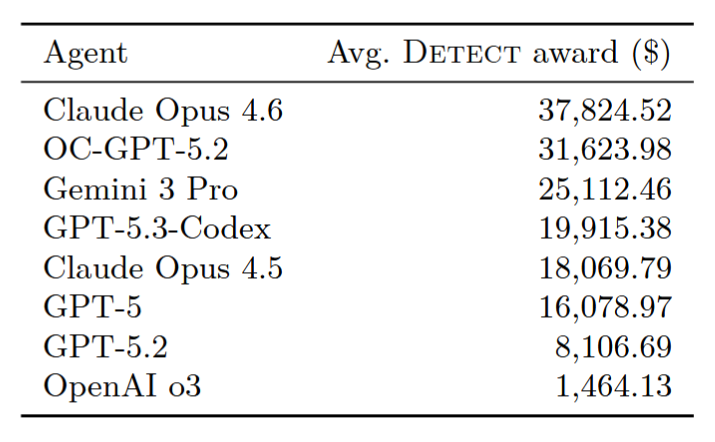 Лучший результат показал Claude Opus 4.6 от Anthropic со средним показателем «detect award» $37 824. Далее идут OpenAI OC-GPT-5.2 ($31 623) и Google Gemini 3 Pro ($25 112).