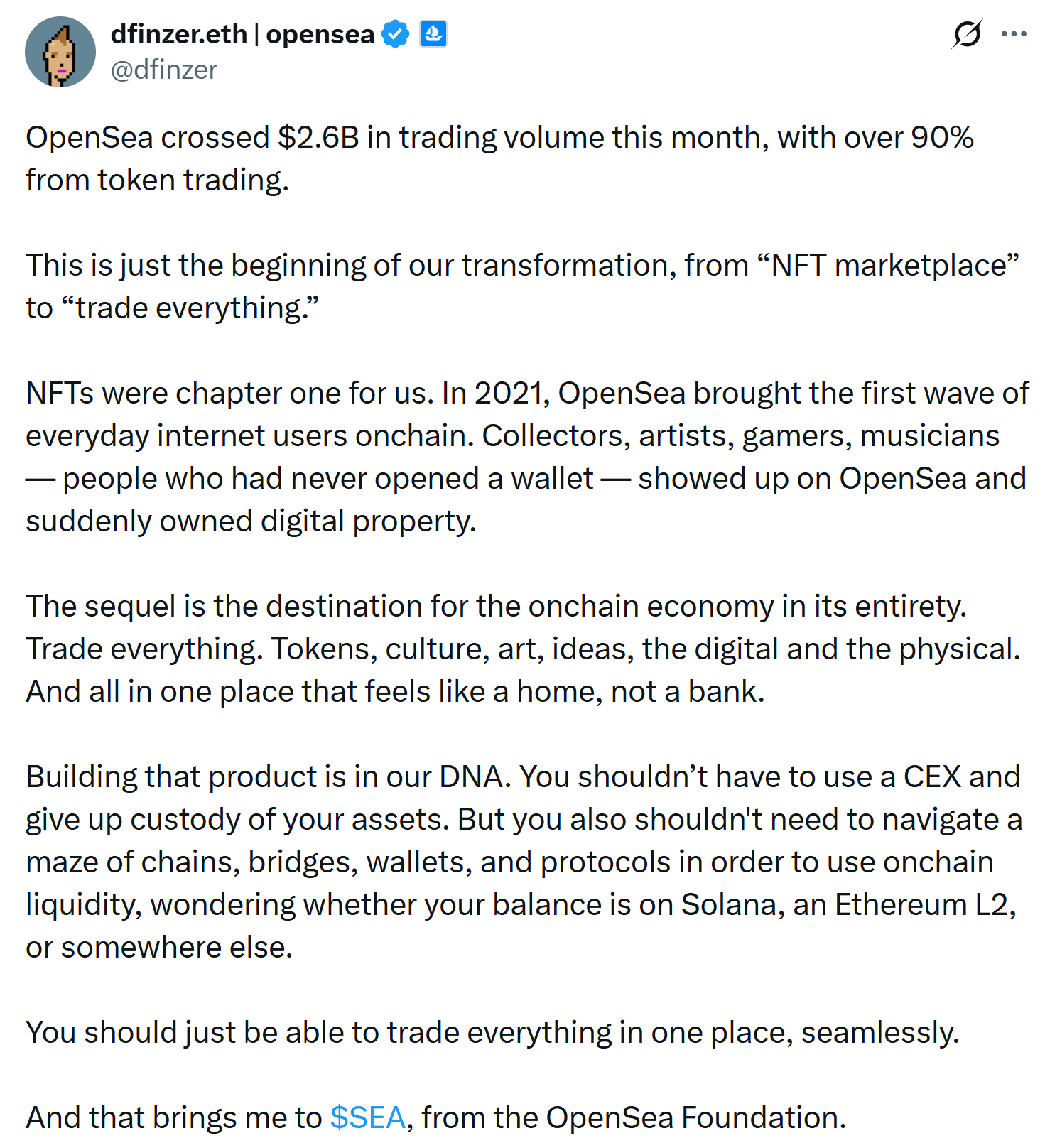 В пятницу на платформе X Финзер объявил, что объем торгов OpenSea в октябре превысил $2.6 миллиарда, более 90% из которых составила торговля токенами, и назвал это началом трансформации платформы на "торговлю всем".