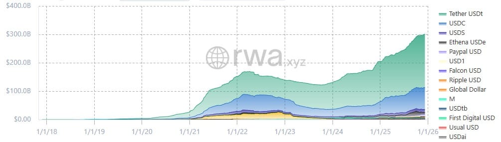 Общая рыночная капитализация стабильных монет достигла рекордного уровня чуть более 300 миллиардов долларов, по данным RWA.xyz.