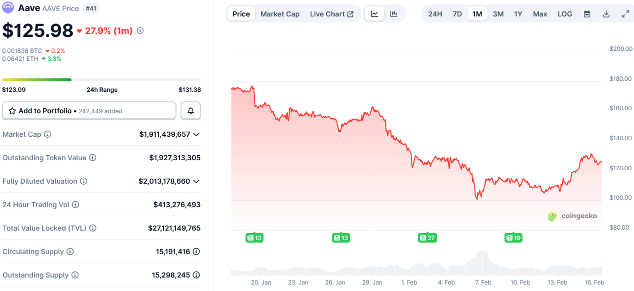 С начала 2026 года AAVE упал на 15,2% — до $125,98 — и остается примерно на 81% ниже исторического максимума $661,70, зафиксированного в мае 2021 года.