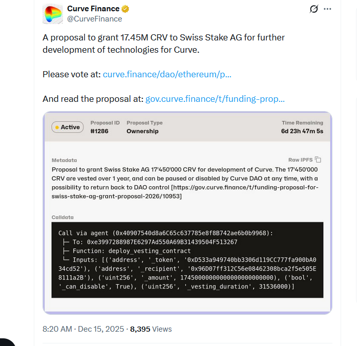 Грант, стоимостью примерно 6,6 миллиона долларов по текущим ценам, будет выдан компании Swiss Stake AG, которая стоит за Curve, и последует за предыдущим грантом, присужденным в конце 2024 года.