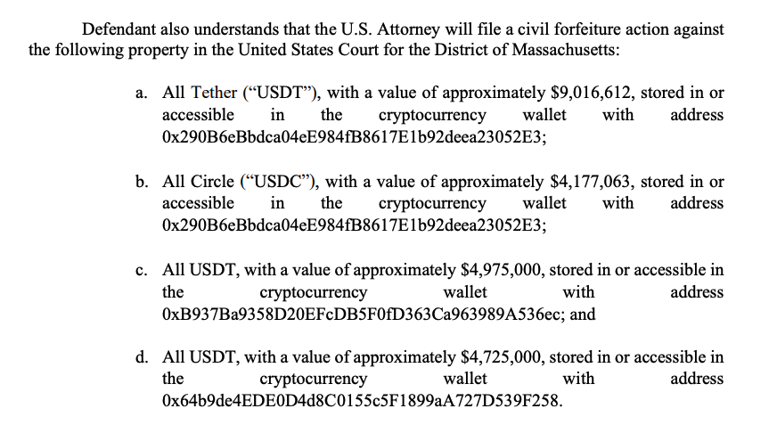 В письме о признании вины, адвокат Массачусетса Фоли упомянул, что активы, перечисленные в разделе конфискации соглашения Gotbit, находятся под полным контролем ответчика от имени Gotbit, несмотря на то, что эти активы принадлежат Gotbit.