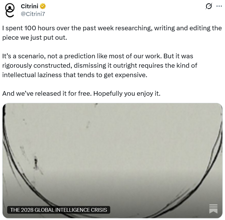 О Citrini почти не говорили до понедельника, когда их отчет «Global Intelligence Crisis» собрал более 22 млн просмотров в X и поднял тему того, что ИИ-агенты способны настолько разогнать корпоративную прибыль, что человеческий труд станет все менее нужным, а это может привести к рецессии.