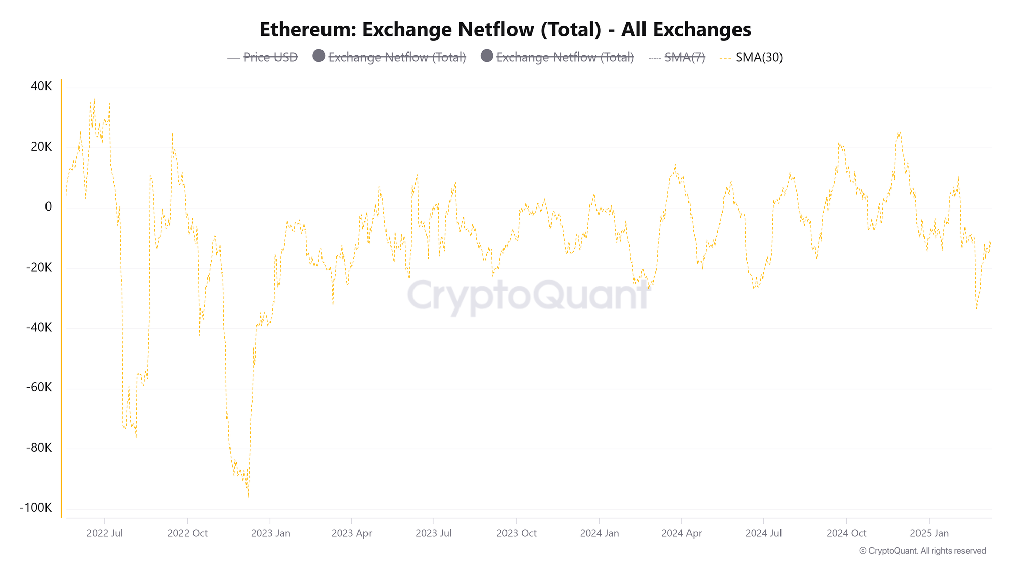 Поставщик ончейн данных CryptoQuant подтверждает подобную картину. Простое скользящее среднее 30 дней для чистых потоков Ethereum упало до примерно 30 000 ETH на прошлой неделе, что было в последний раз зафиксировано в конце декабря 2022 года.