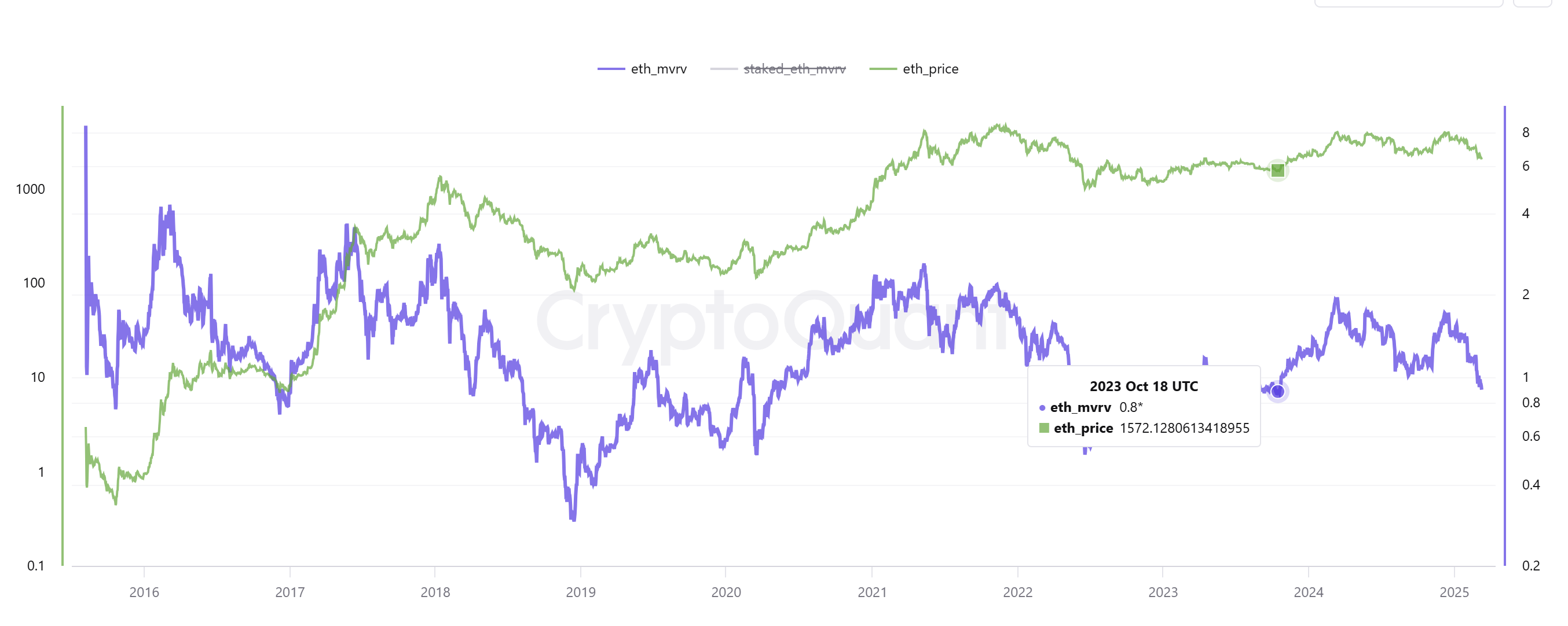 Коэффициент MVRV ниже 1 указывает на недооцененность, сигнализируя о потенциальной возможности для покупки. Для контекста, когда коэффициент MVRV упал до 0,8 18 октября 2023 года, Ether достиг локального дна около $1600, после чего произошло бычье изменение и начался бычий тренд 2024 года.