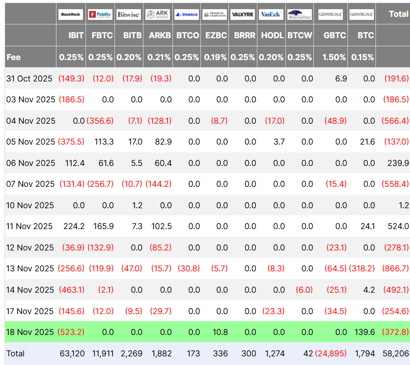 Американские спотовые Bitcoin (BTC) ETF продлили свою пятидневную полосу убытков во вторник, зафиксировав еще $372 миллиона чистого отрицательного оттока, по данным Farside Investors.