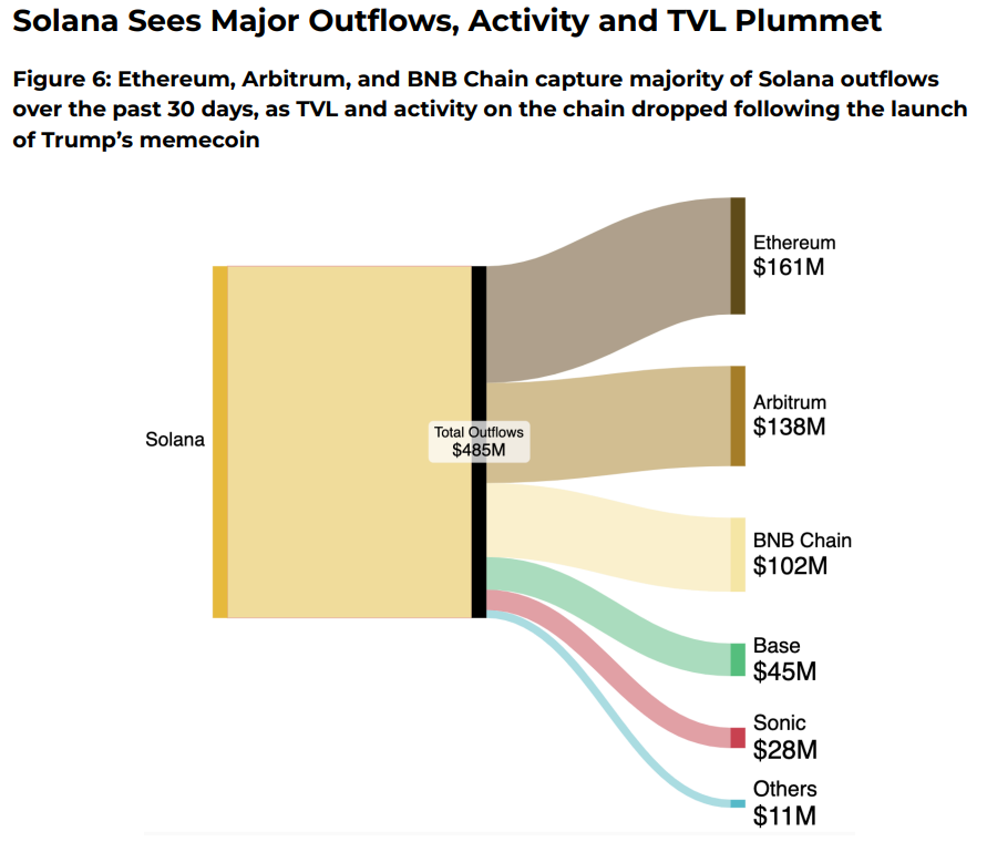Solana (SOL) потеряла более 485 миллионов долларов за последние 30 дней, а капиталы инвесторов главным образом перетекли в Ethereum, Arbitrum и BNB Chain.