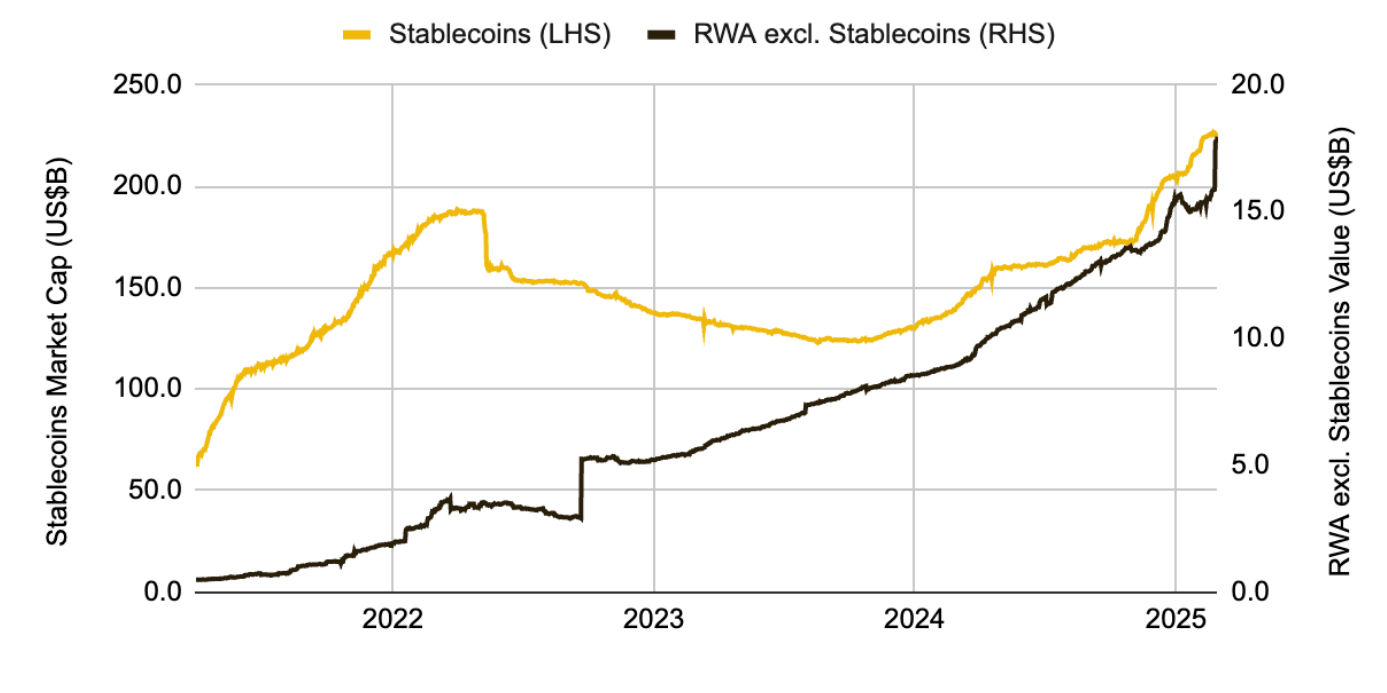 Стабильные монеты превысили рекордную отметку в $224 миллиарда, в то время как RWAs в сети превысили совокупную рекордную отметку в $17,1 миллиарда среди 82,000 держателей активов, как сообщалось 3 февраля.
