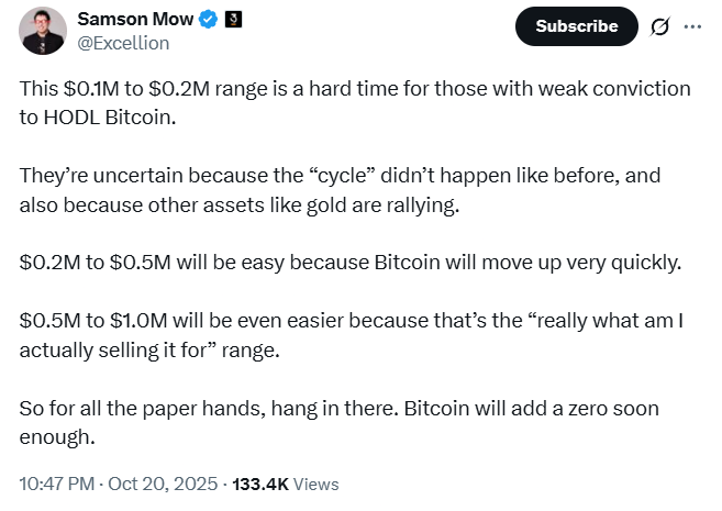 «Диапазон от $0.1M до $0.2M — трудное время для тех, кто не уверен в удержании Биткоина», — написал генеральный директор Jan3 Самсон Моу в понедельник в посте на платформе X, добавив: