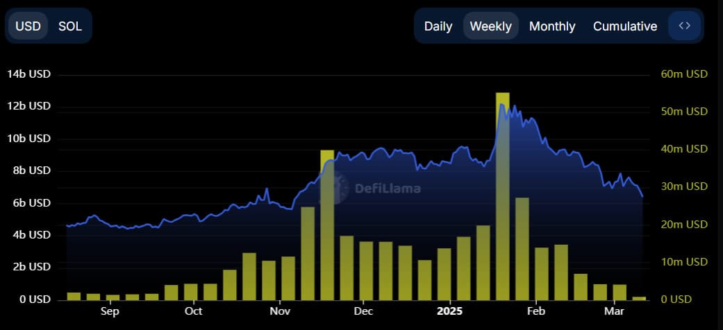 Еженедельный доход сети на блокчейне Solana достиг рекордного уровня в $55,3 миллиона в середине января на пике ажиотажа вокруг эмиссии мемекоинов.